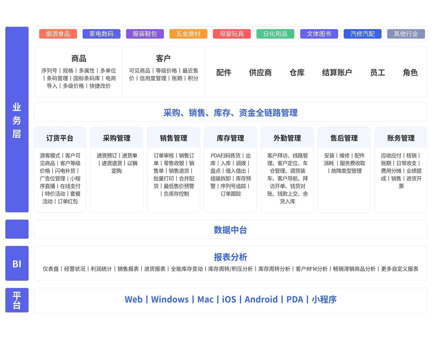 ● 行業適配性極強,覆蓋家電、食品、服裝、五金建材等眾多行業。針對不同行業特點,推出了快消版、家電數碼版等專版,各專版具備符合行業特性的功能,如家電數碼版的售后管理(安裝、維修、組裝拆卸、序列號等功能),食品版的保質期管理和批次管理等,能夠深度滿足各行業企業的實際業務需求。